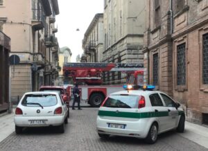 ALESSANDRIA – Vigili del Fuoco, Polizia Municipale e operai del Comune impegnati questa mattina in via Rattazzi per la caduta di tegole da uno dei palazzi, causata probabilmente dal forte vento della scorsa notte.